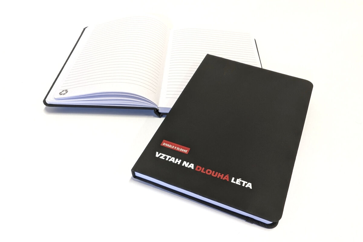 Černý poznámkový blok v tvrdých deskách s potiskem, elastická guma na zavírání, záložka.