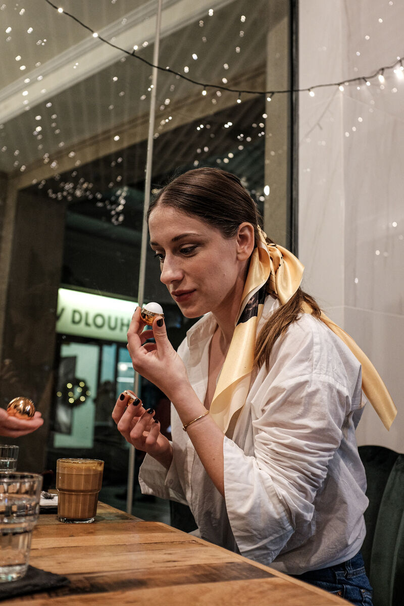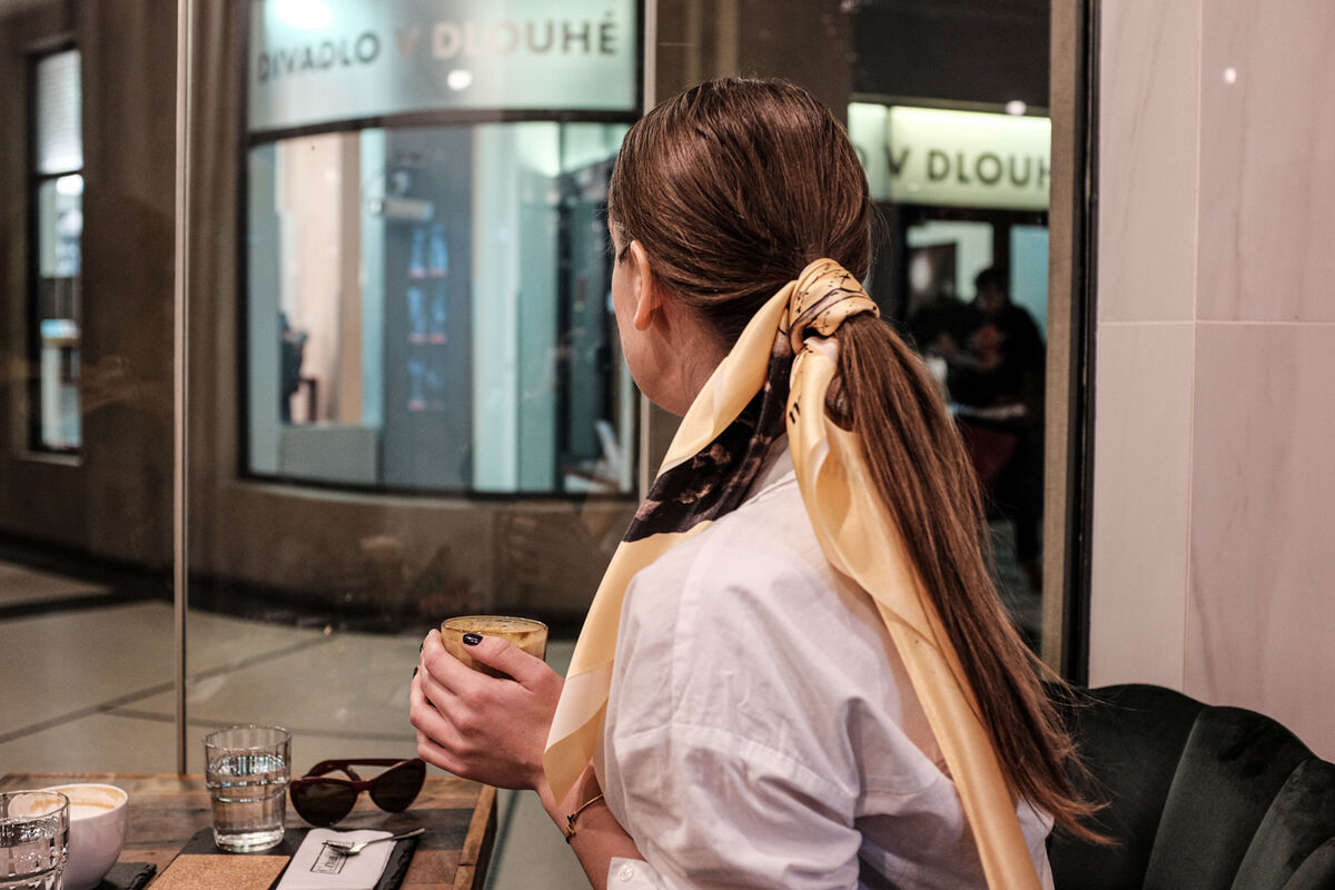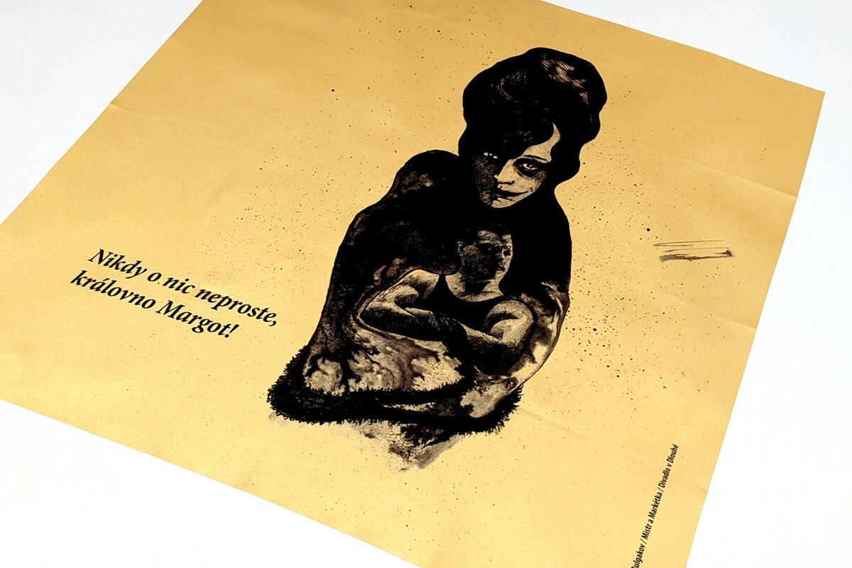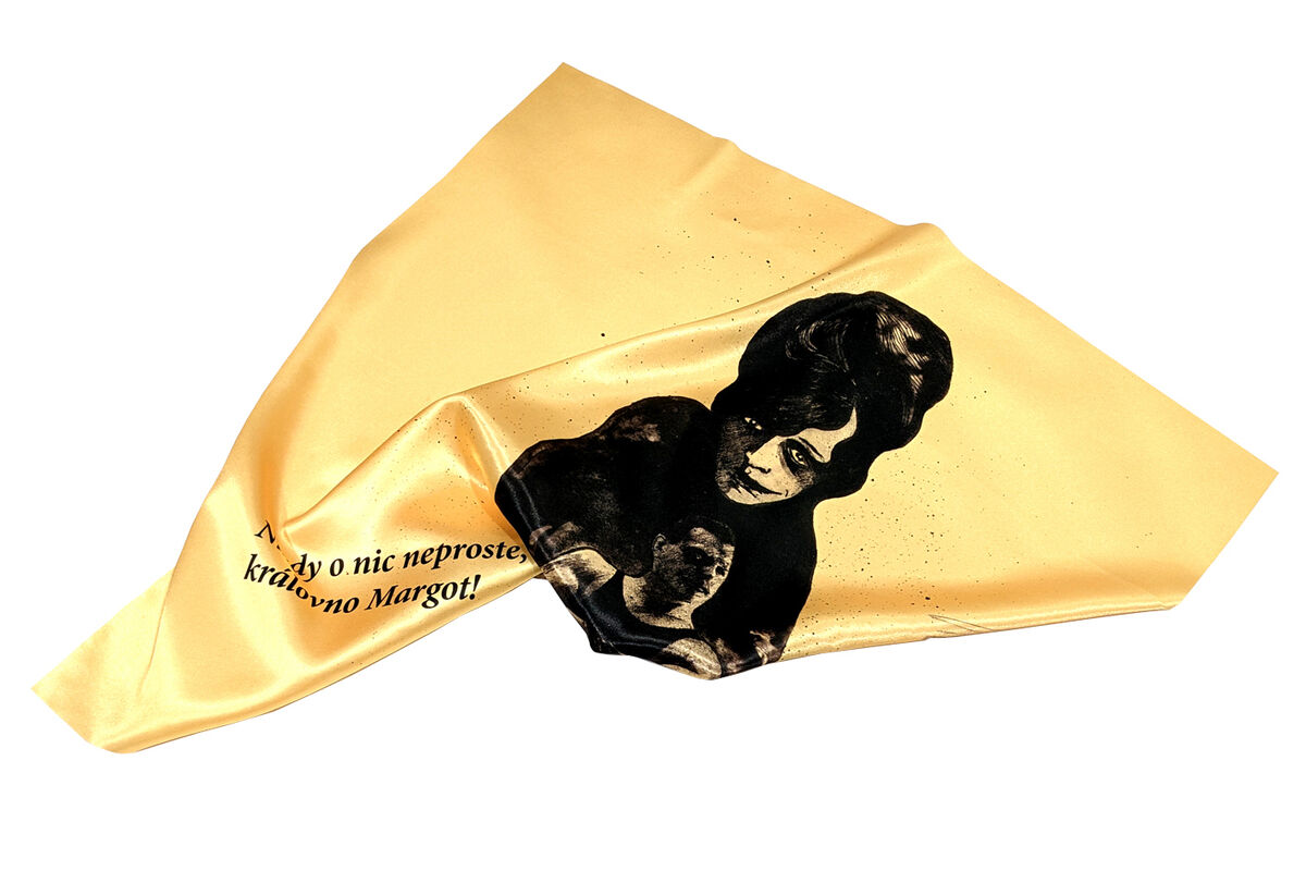 Saténový čtvercový šátek s motivem z inscenace Mistr a Markétka. Autorkou motivu je výtvarnice Tereza Bartůňková. Limitovaná edice pouze 50 kusů. Šátek má zlatou barvu, potisk je černý, text na šátku: