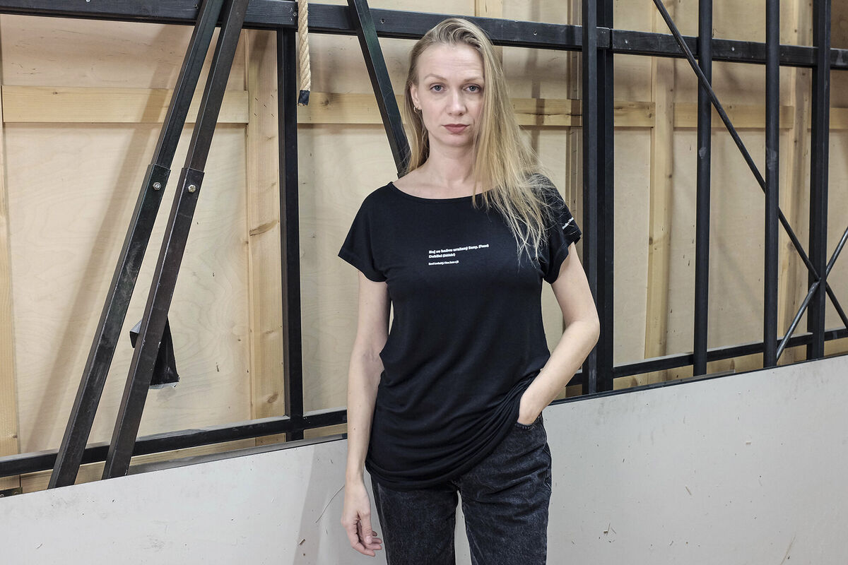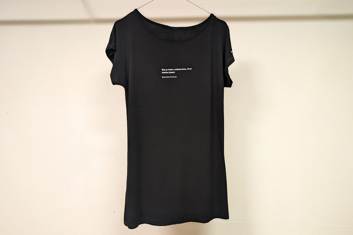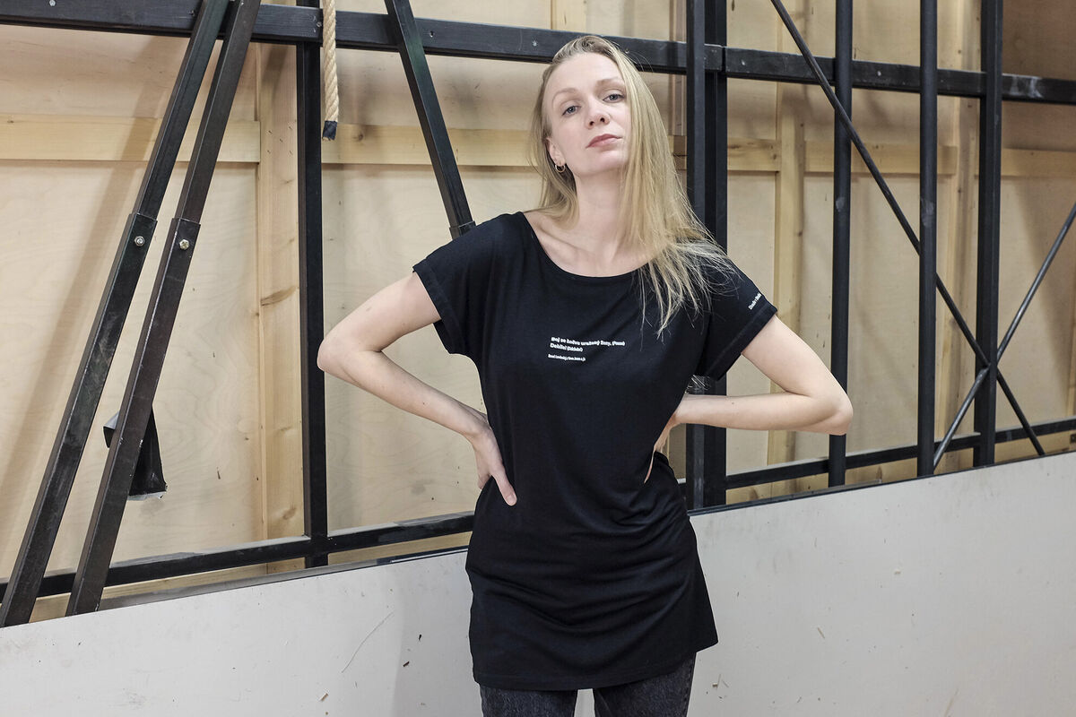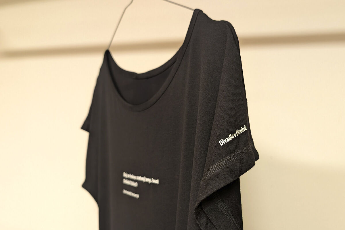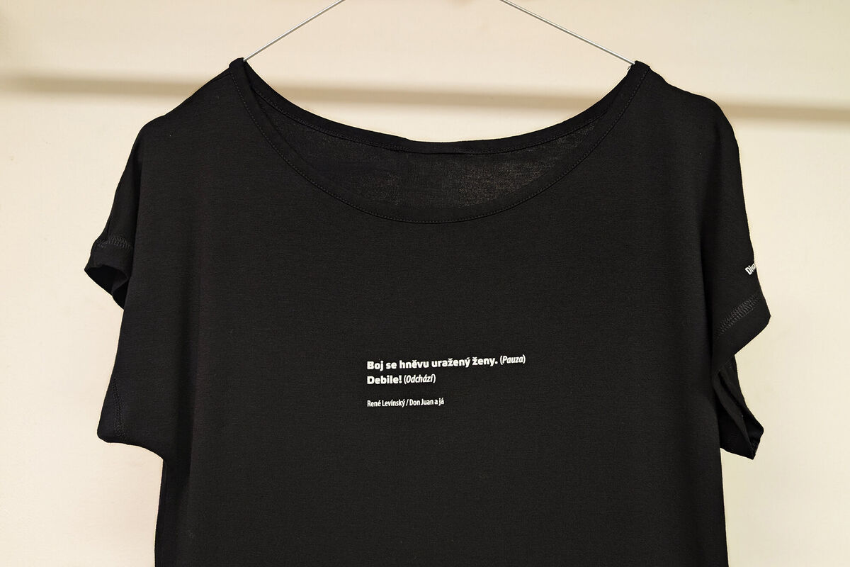 Černé dámské tričko s bílým potiskem v prodloužené délce, které jsme opatřili ikonickým citátem postavy Elišky z inscenace Don Juan a já.