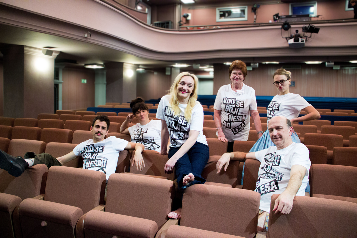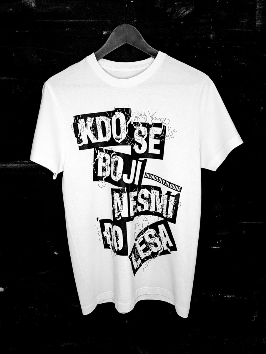 Bílá bavlněná unisex trička klasického střihu s logem Divadla v Dlouhé a mottem sezony 2025/26: KDO SE BOJÍ, NESMÍ DO LESA.