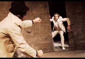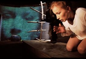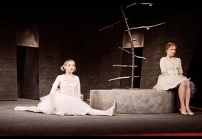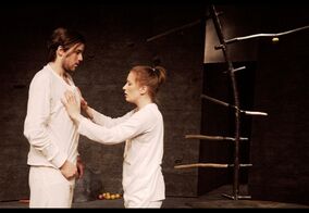Do kasárensky strohého, chladného prostoru působícího jako jeskyně, který je arénou pro toto první vystoupení, vstupují před nimi inscenátoři onoho pokusu. Navíc obrazovky rozmístěné nad arénou i velká promítací plocha v pozadí scény dovolují těmto dvěma divákům nahlédnout do zákulisí a proniknout kdykoliv do nejdůvěrnějších skrytých chvilek účinkujících. V inscenaci režisérky Hany Burešové se začíná jemně až něžně, s půvabnou dojemností a úsměvností naivity, když si ti čtyři nevinní a jaksi neutrální tvorové uvědomují sebe sama jako lidské bytosti.