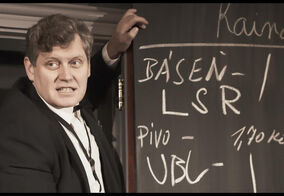 A hospodský - sám Hanuš - si křídou na tabuli dělá čárky vedle piva, vína a dršťkové také k položkám "báseň" či "píseň". Neboli - "pár dobrejch fláku od Pepika Kainara", jak říká hospodský i podtitul inscenace.