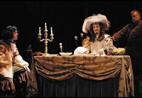 Fedotov se scénografem Adamem Pitrou až pietně dodrželi hierarchii autorem předepsaného rozvržení scény. Temné podsklepí inkvizičního Bratrstva svatoušků, tak se hra původně jmenovala, a jejího spojence, biskupa Charrona (Jiří Wohanka). Falešný a přetvářkou kypící lesk dvora Ludvíka „Slunce“ (Tomáš Turek/Martin Veliký), s hereckým stavem soucítícím příbuzným, Spravedlivým ševcem a královým šaškem (Vlastimil Zavřel).
