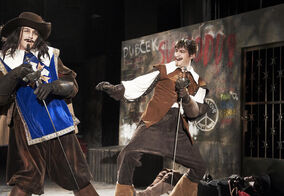 Člověk by řekl, že tak nesourodá témata si na scéně musí jít po krku. Překvapivě, všechny hlavičky zůstanou na svých místech a místo krácení jsou rozšířeny o zlatou korunu divadelního umění. Přechody mezi dvěma dějovými linkami se přirozeně prolínají a mezi jednotlivými obrazy ani není potřeba zhasínat. Navíc k setkání současníků a romantiků ze sedmnáctého století dochází často za docela komických situací. Příkladem může být, když jeden z Mušketýrů spěchá předat důležitou zprávu a chce si zkrátit cestu přes pavlač. Po ní ale zrovna cupitá stará babička, okolo které nezbývá ani milimetr, kterým by se dalo nepozorovaně proklouznout.